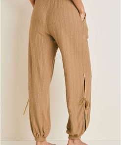 Get the hotel feel right at home with these lightweight joggers that make every day feel like checking in for a five-star stay—the only thing missing is room service! Delicately-textured fabric along with breezy side slits affixed with feminine bow ties give these easy-chic lounge pants an elevated look. What are you waiting for? Book your stay now.* Sizes: XS (2). S (4-6). M (8-10). L (12-14). XL (16)* Mid rise* Elastic waistband* Pockets* Side slits* Bow ties at sides* Rayon/polyester/nylon/spandex. Imported