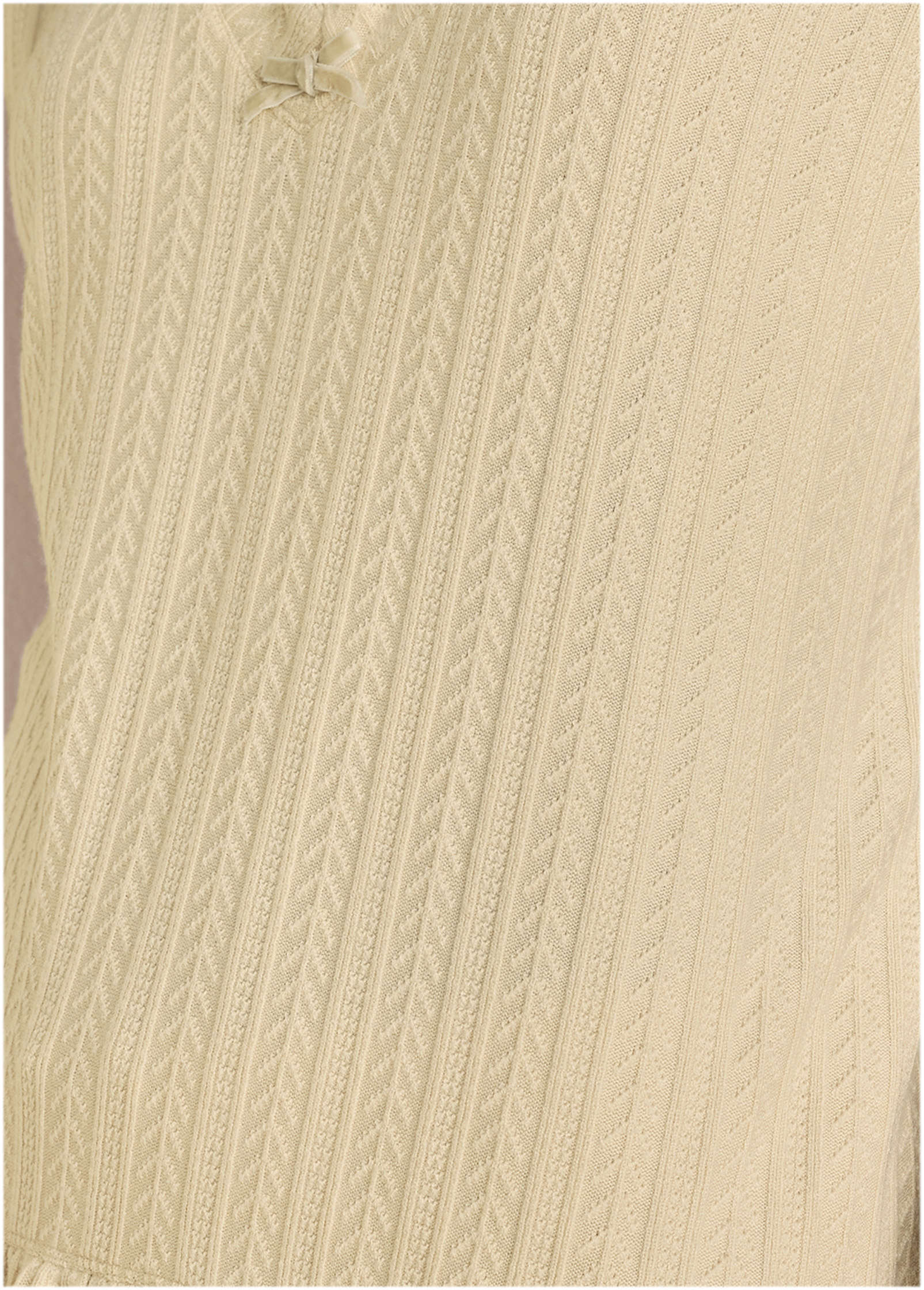 Meet the flirtiest loungewear you’ve ever seen. With a sweet V-neckline. delicate bow detail. and ruffle hem. this top brings all the romance to your downtime. The cable knit look adds texture. while the soft. cozy fabric makes it perfect for sipping mimosas in style. Pair it with the matching Brunch Knit Short for a set that’s five-star stay approved. Whether you’re lounging at home or enjoying a luxe hotel getaway. this top is your go-to for looking effortlessly fabulous.* Sizes: XS (2). S (4-6). M (8-10). L (12-14). XL (16)* V-neckline: Flattering and feminine with a tiny bow accent.* Ruffle hem: A playful. flirty finish for extra charm.* Cable knit look: Cozy texture with a lightweight feel.* Soft & lounge-ready: Perfect for slow mornings and hotel stays (especially if there’s room service).* Pair it up: Wear with the Brunch Knit Short for an ultra-cute matching set.* Rayon/poly/nylon/spandex. Imported