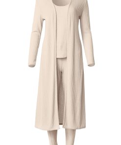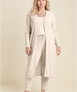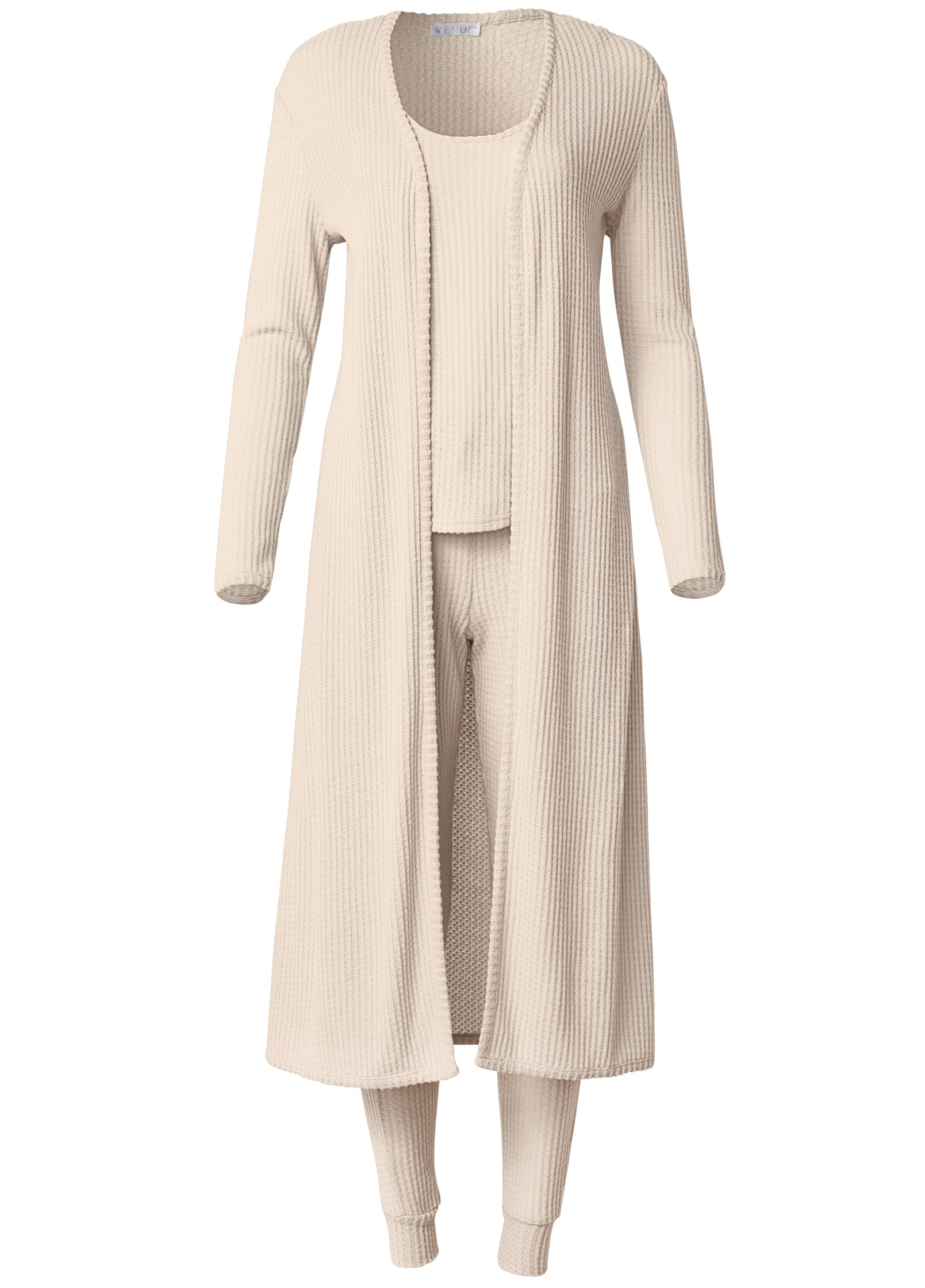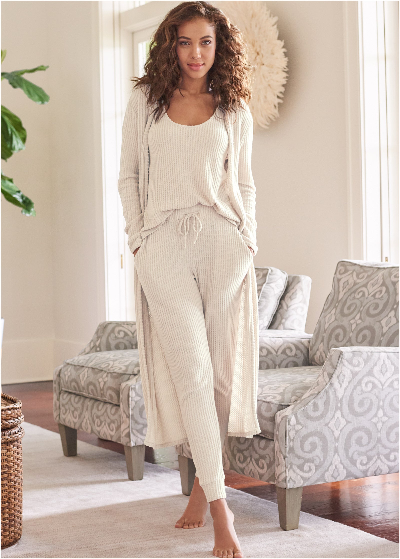 Snuggle up in this super-soft waffle knit lounge set that includes a duster. tank and joggers that tie at the waist for a perfect fit. Cozy enough to lounge on the couch all day. yet chic enough for your morning coffee run. be warned that you won’t want to take it off. In fact. once you wear it you’ll probably be tempted to buy it in more colors.* Sizes: XS (2). S (4-6). M (8-10). L (12-14). XL (16)* Plus sizes: 1X (18-20). 2X (22-24). 3X (26-28)* Three-piece set includes duster. tank and jogger pants* Pants: Side pockets and tie waist* Duster: 48 from shoulder* Top: 25 from shoulder* Pants: 29 inseam* Polyester/rayon/spandex. Imported
