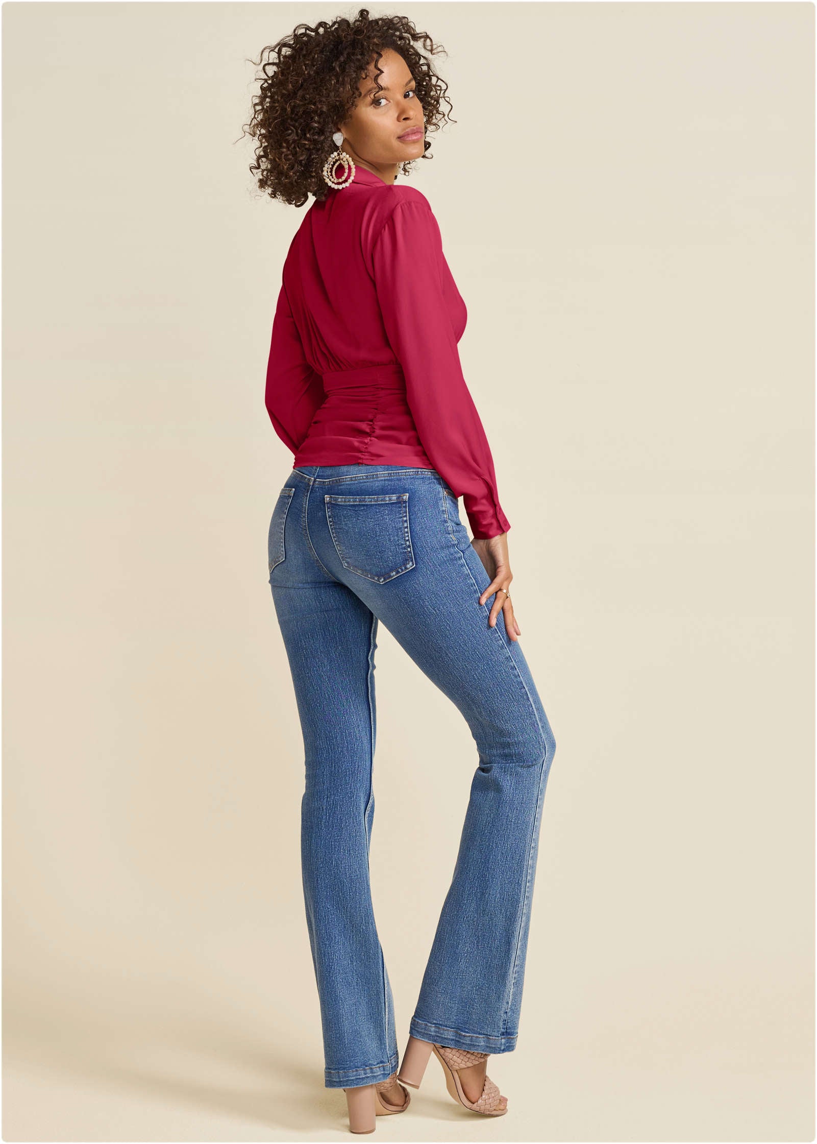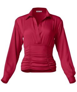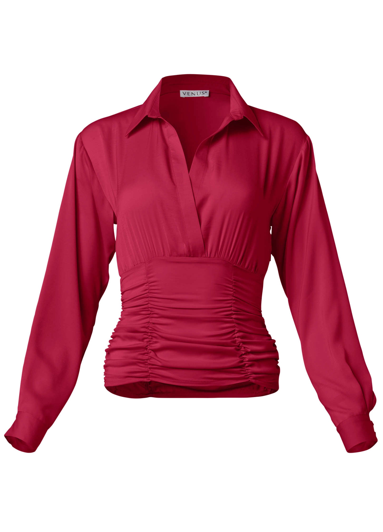 Meet your new go-to blouse—polished. flattering. and ready for anything. The structured collared neckline keeps it sleek. while the ruched waist hugs your curves in all the right places. With long sleeves for a touch of sophistication. this top effortlessly transitions from office hours to after-hours. Pair it with tailored pants and a blazer for work or switch to denim and heels for a date-night glow-up.* FLATTERING RUCHED WAIST: Designed to cinch and sculpt. highlighting your shape while keeping it comfortable.* Sizes: XS (2). S (4-6). M (8-10). L (12-14). XL (16)* Plus sizes: 1X (18-20). 2X (22-24). 3X (26-28)* CLASSIC WITH A TWIST: A sharp collared neckline meets a figure-enhancing fit for the perfect balance of structured and sultry.* VERSATILE STYLE: Sleek enough for the office. chic enough for cocktails—just swap your bottoms and go.* ELEVATED ESSENTIAL: Pairs seamlessly with black pants for work or denim and heels for an effortless date-night look.* Poly. Imported