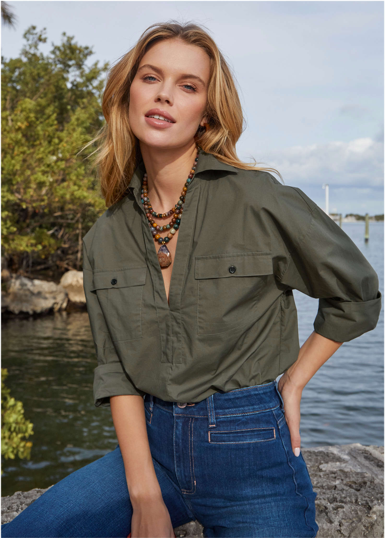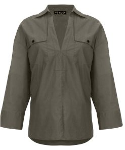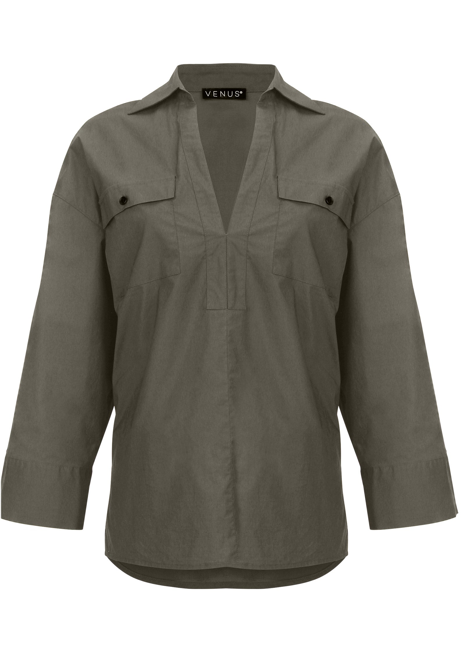 Tags: brand:VENUS, category:Clothing, color-code:DSOL, color-description:Olive, color-family:GREEN, customer-rating:4 stars & up, fabric-class:Solids, fabric-type:Solids, final sale, inventory-VS25O, lining-type:Unlined, markdown, material-composition:100% cotton, occasions:Casual, publication-list:25Q1_JAN_PRE-SPRING, size-chart:clothing, sleeve-length-type:Long, style-number:Z246008, style:Long Sleeve, type:Shirts & Sweaters